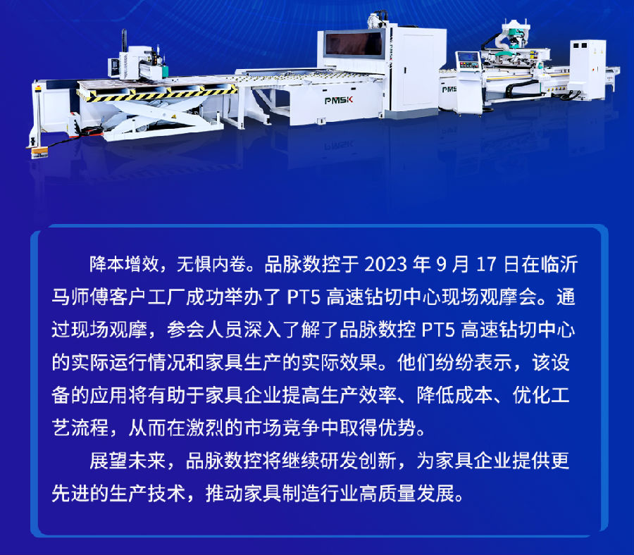 臨沂馬師傅家居有限公司是一家專注于板式家具制造的公司。2023年4月的臨沂展會(huì)期間訂購(gòu)了品脈數(shù)控的PT5高速鉆切中心。此前,馬師傅工廠使用著開(kāi)料機(jī)、封邊機(jī)和側(cè)孔機(jī)進(jìn)行生產(chǎn),每天的產(chǎn)能只有40張板。然而,伴隨著訂單量的增加,工廠的產(chǎn)能遠(yuǎn)遠(yuǎn)達(dá)不到生產(chǎn)需求。為了解決這個(gè)問(wèn)題,馬總決定擴(kuò)充更新設(shè)備。馬總偶然間看到了我們的PT5高速鉆切中心的加工視頻,并對(duì)其加工模式產(chǎn)生了濃厚的興趣。于是,馬師傅在今年四月份前往臨沂展會(huì),通過(guò)詳細(xì)了解PT5的生產(chǎn)模式和設(shè)備優(yōu)勢(shì)之后,決定訂購(gòu)該臺(tái)設(shè)備。該設(shè)備于五月份正式投產(chǎn)使用。投產(chǎn)后,馬師傅工廠的日產(chǎn)能從原先的40張板增加到了現(xiàn)在的140張板,產(chǎn)能提高了3倍多。并且PT5整臺(tái)設(shè)備只需要一個(gè)人工便能夠輕松操作,大大降低了人工成本、生產(chǎn)成本,實(shí)現(xiàn)了效率翻倍。