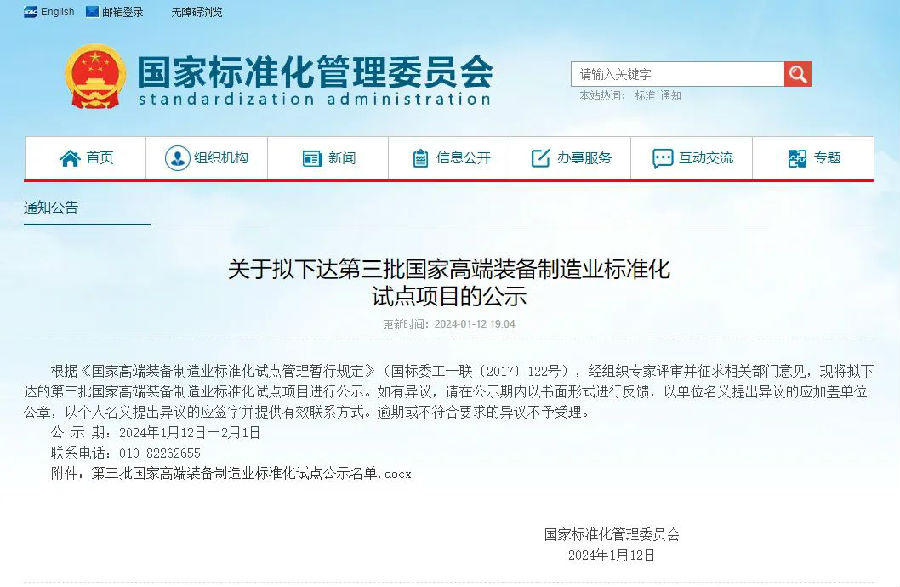 2024年1月12日,國家標(biāo)準(zhǔn)化管理委員會(huì)公布了第三批國家高端裝備制造業(yè)標(biāo)準(zhǔn)化試點(diǎn)項(xiàng)目,中品智能機(jī)械有限公司入選。