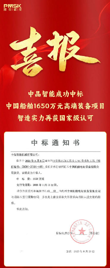 重磅喜訊!經(jīng)過激烈的市場競爭和嚴格的招標評審,中品智能機械有限公司(以下簡稱“中品智能”)憑借其卓越的技術(shù)方案、可靠的產(chǎn)品質(zhì)量和完善的服務(wù)體系,成功中標中國船舶集團有限公司旗下電站設(shè)備配套的分切機床加工線及CNC集成加工線項目,中標金額高達人民幣1650萬元。這一里程碑式的訂單,標志著中品智能在高端智能制造裝備領(lǐng)域的技術(shù)實力和市場地位獲得了國家級大型央企的高度認可。